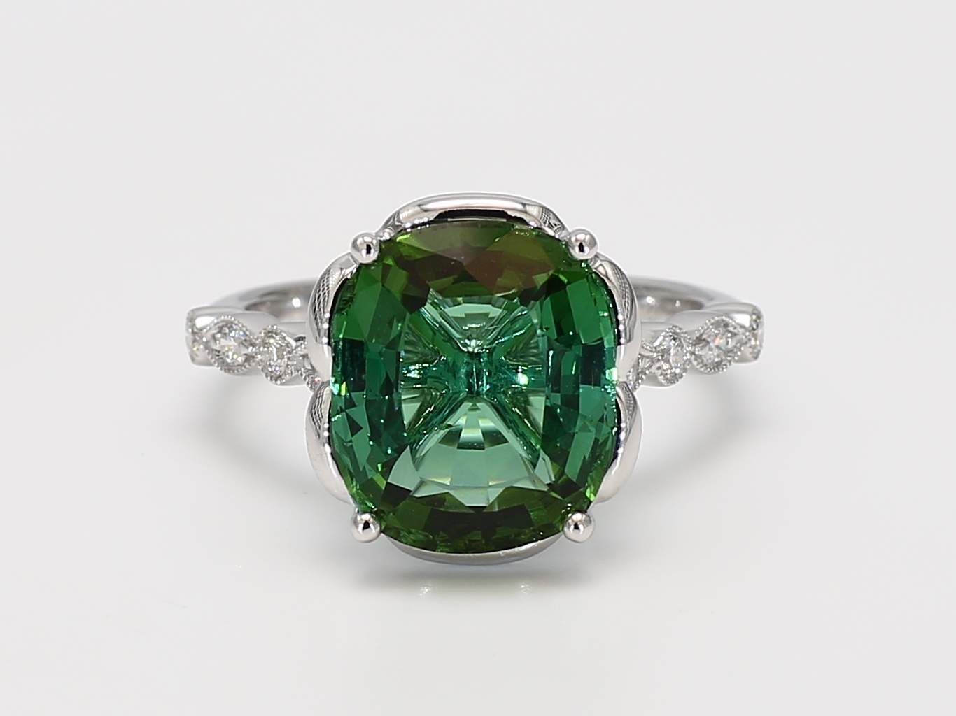 CUSHION GREEN TOURMALINE & ROUND DIAMOND 14KW RING