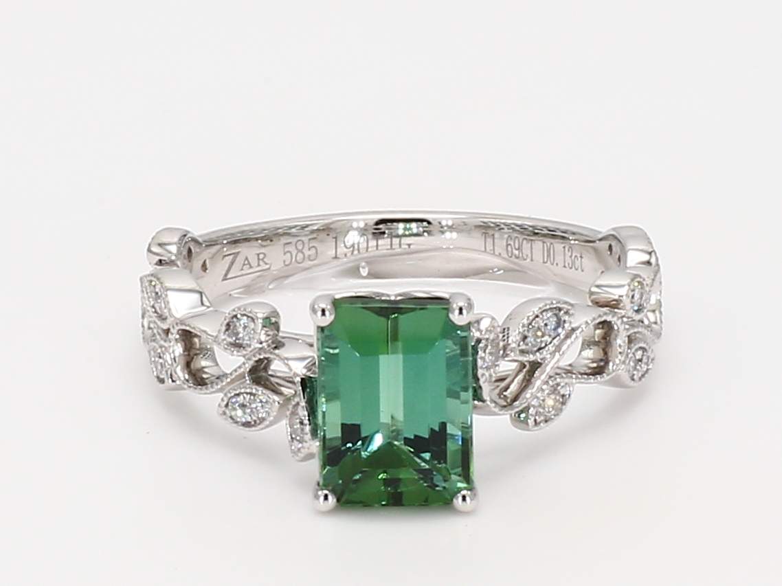 EMERALD CUT GREEN TOURMALINE & ROUND DIAMOND 14KW RING