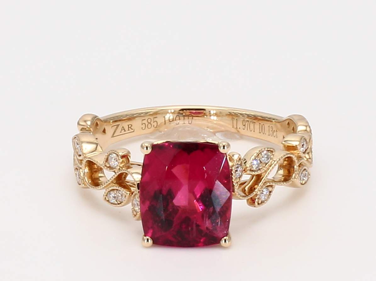 CUSHION RUBELLITE & ROUND DIAMOND 14KY RING