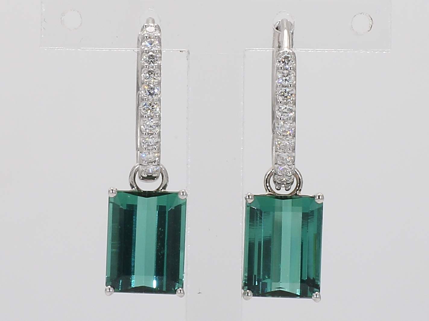 EMERALD CUT GREEN TOURMALINE & ROUND DIAMOND 14KW EARRING