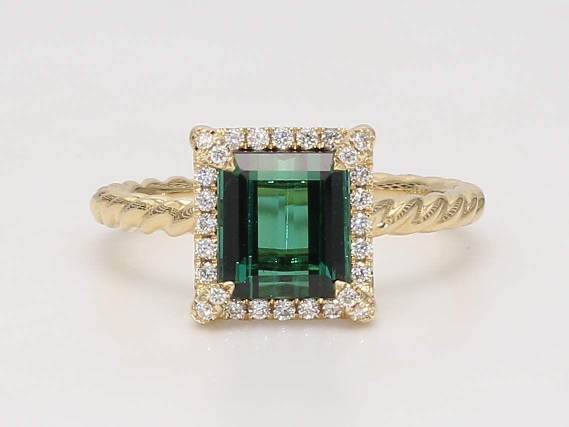 EMERALD CUT GREEN TOURMALINE & ROUND DIAMOND 14KY RING