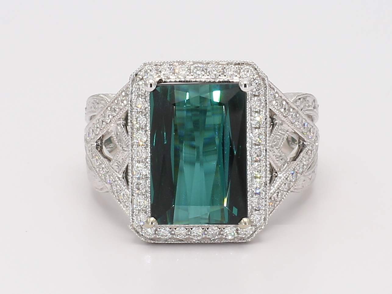 EMERALD CUT BLUE TOURMALINE & ROUND DIAMOND 14KW RING