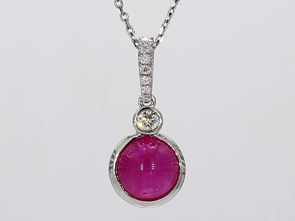 ROUND CABOUCHON RUBY & ROUND DIAMOND 14KW PENDANT
