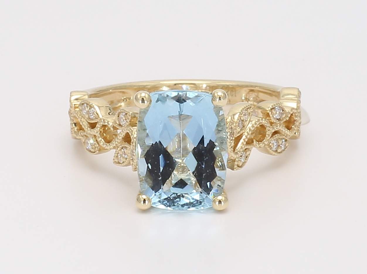 CUSHION AQUAMARINE & ROUND DIAMOND 14KY RING