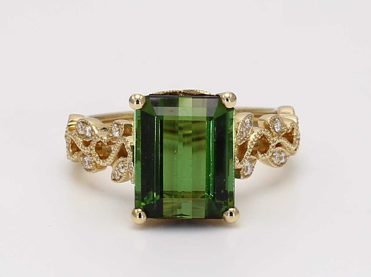 EMERALD CUT GREEN TOURMALINE & ROUND DIAMOND 14KY RING