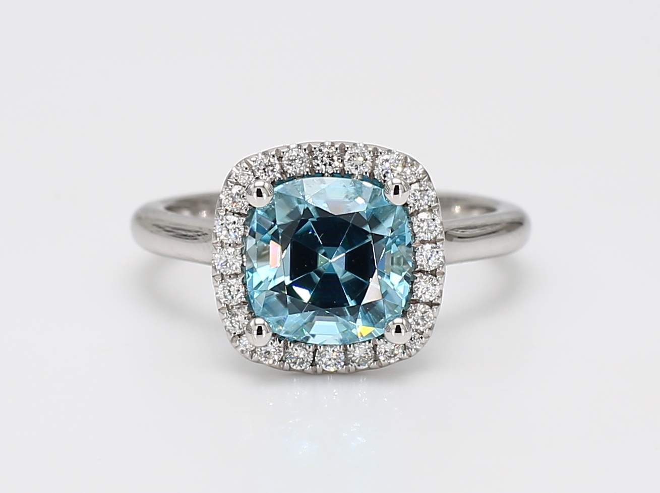 CUSHION BLUE ZIRCON & ROUND DIAMOND 14KW RING