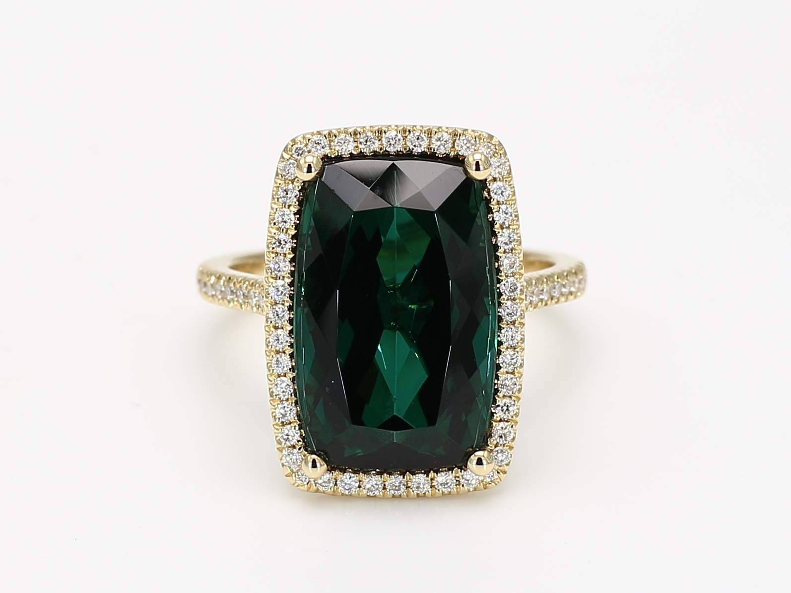 CUSHION GREEN TOURMALINE & ROUND DIAMOND 14KY RING