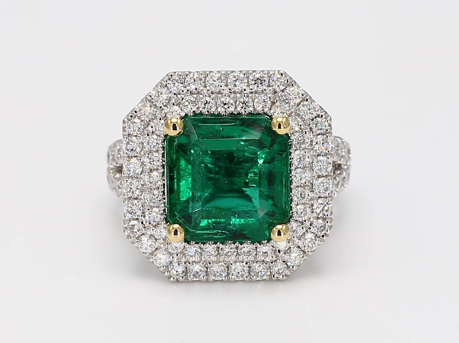 EMERALD CUT EMERALD VIVID GREEN CDC 2311195 & ROUND DIAMOND PLATINUM RING