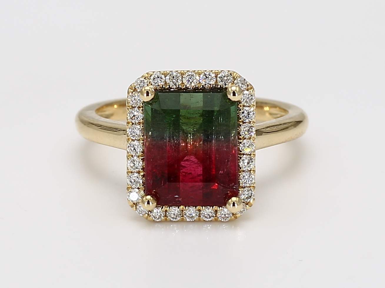 EMERALD CUT WATERMELON TOURMALINE & ROUND DIAMOND 14KY RING