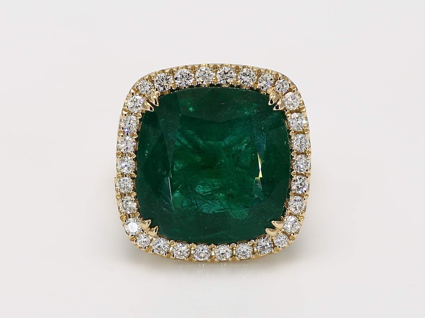 CUSHION EMERALD CDC 2101447 & ROUND DIAMOND 14KY RING