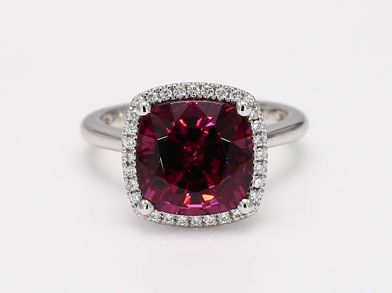 CUSHION RHODOLITE GARNET & ROUND DIAMOND 14KW RING