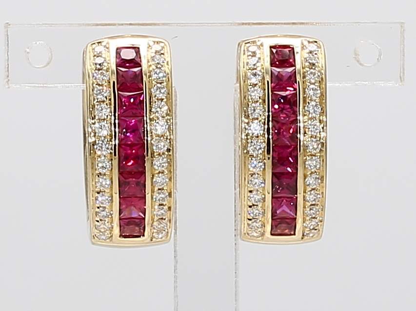 PRINCESS CUT RUBY & ROUND DIAMOND 14KY EARRING