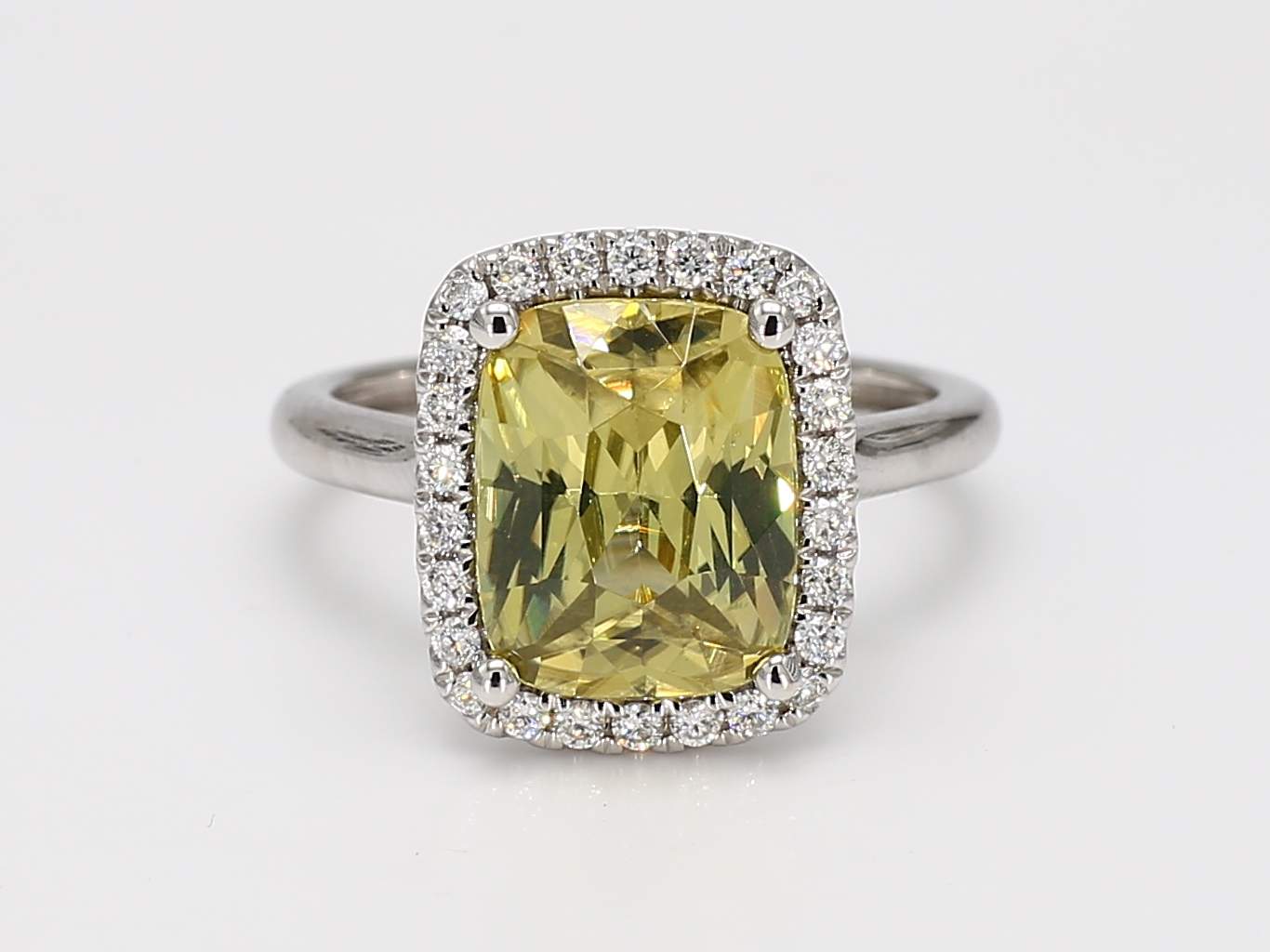 CUSHION YELLOW ZIRCON & ROUND DIAMOND 14KW RING