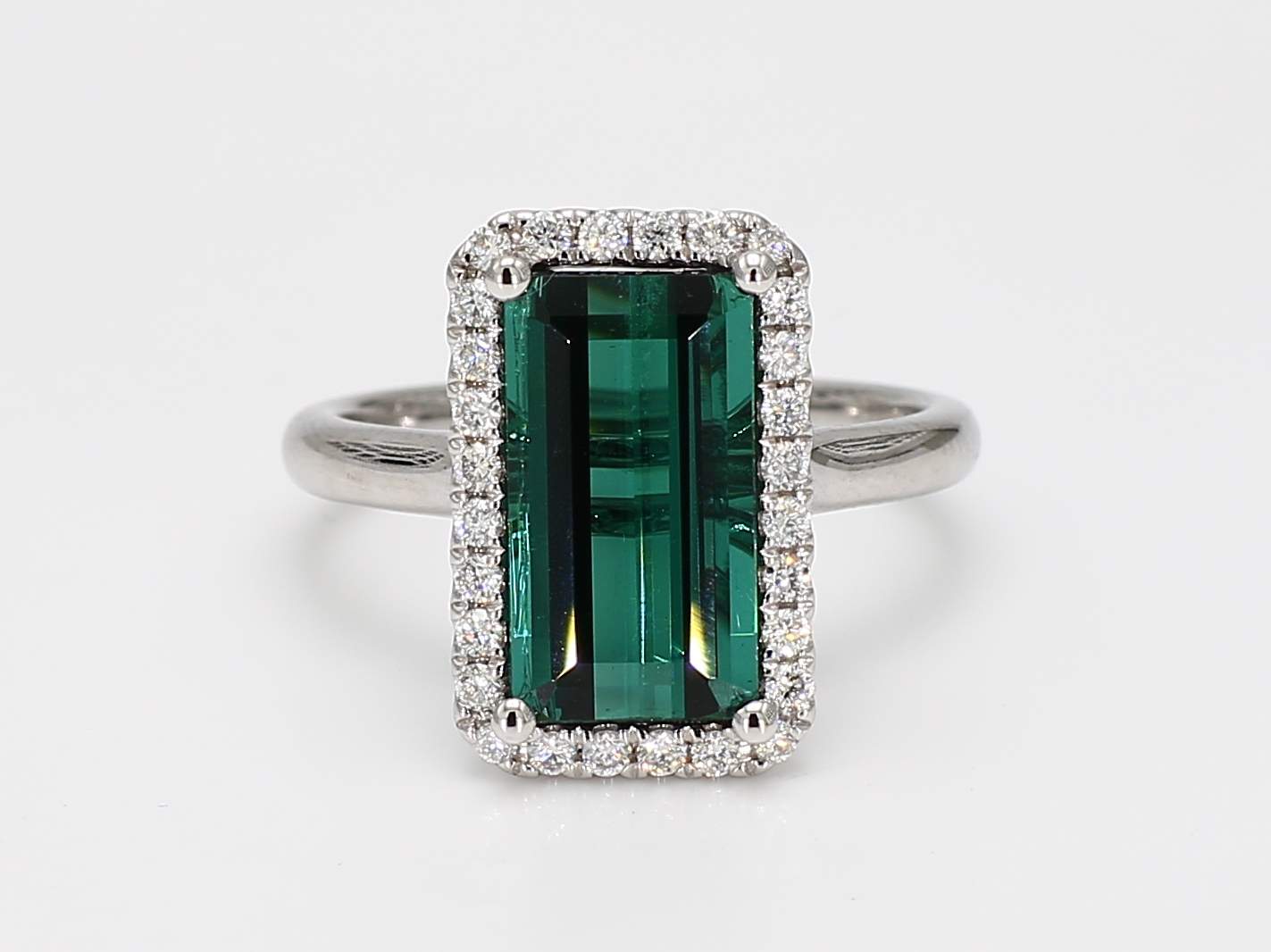 EMERALD CUT GREEN TOURMALINE & ROUND DIAMOND 14KW RING