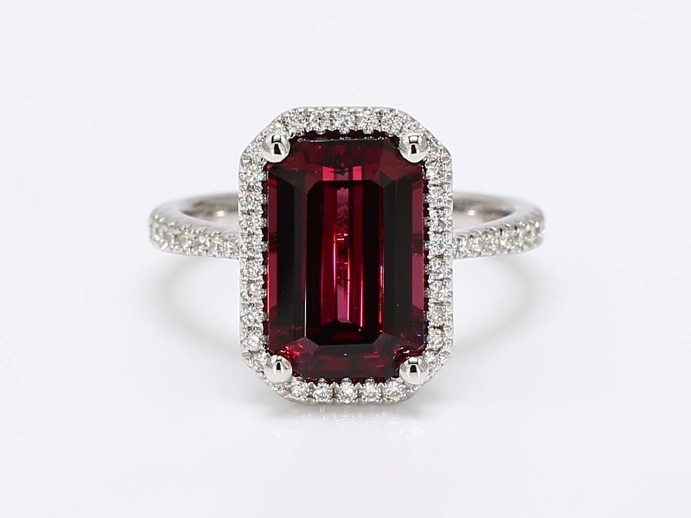 EMERALD CUT RHODOLITE GARNET & ROUND DIAMOND 14KW RING