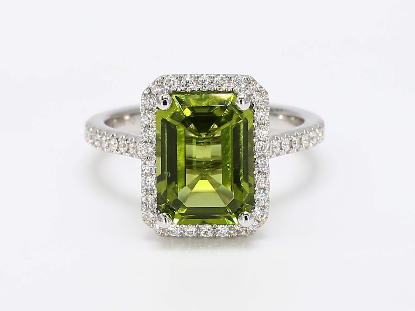 EMERALD CUT PERIDOT & ROUND DIAMOND 14KW RING