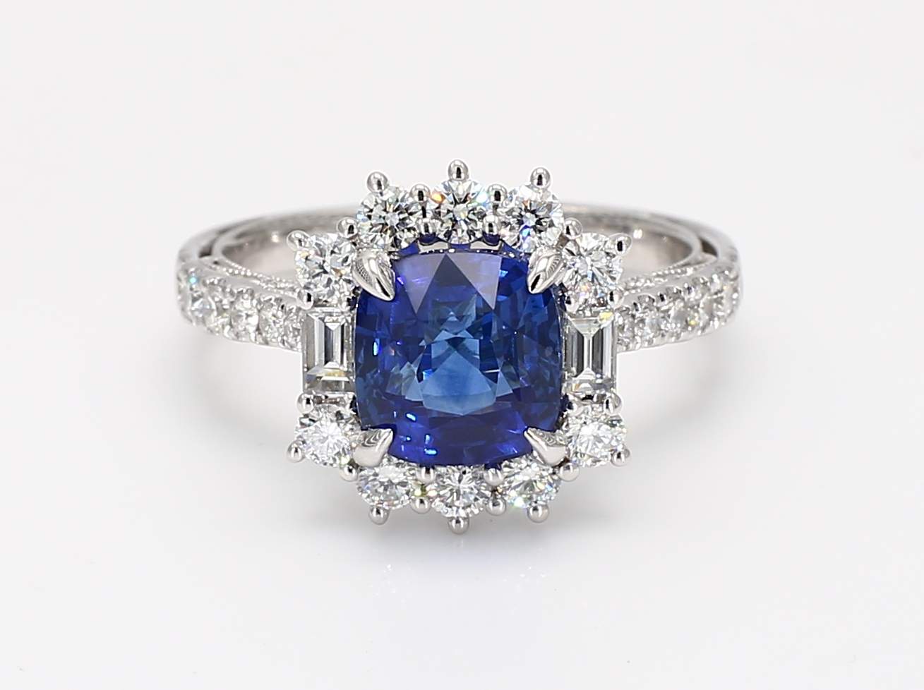 CUSHION SAPPHIRE CDC 2411315 & ROUND & BAGUETTE DIAMOND 14KW RING