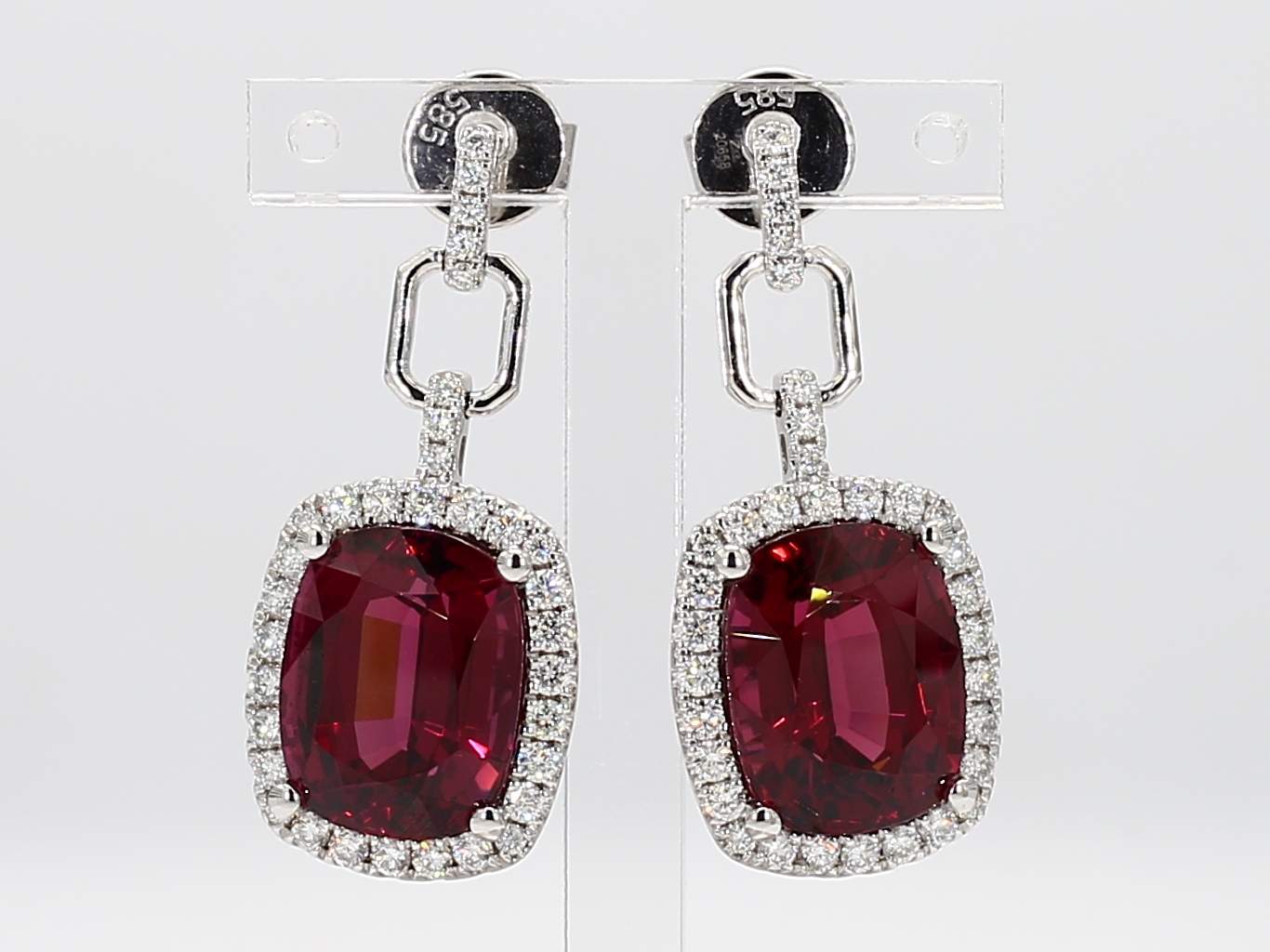 CUSHION RHODOLITE GARNET & ROUND DIAMOND 14KW EARRING