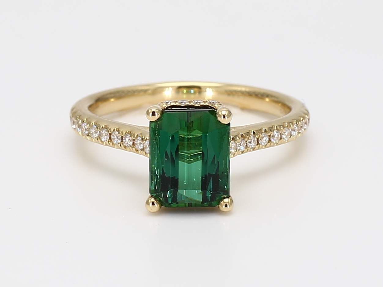 EMERALD CUT GREEN TOURMALINE & ROUND DIAMOND 14KY RING