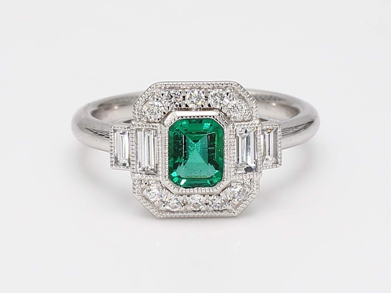 EMERALD CUT EMERALD & BAGUETTE DIAMOND & ROUND DIAMOND 14KW RING