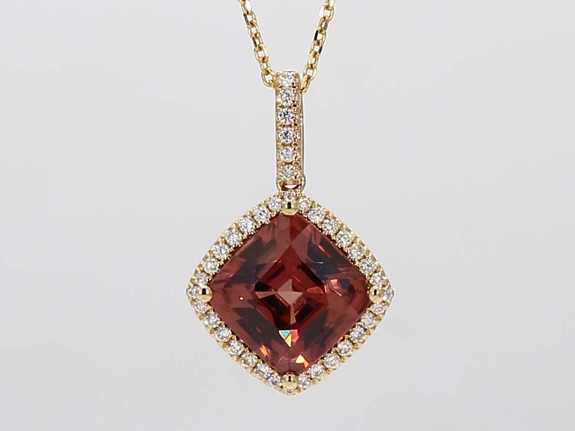CUSHION RED ZIRCON & ROUND DIAMOND 14KY PENDANT