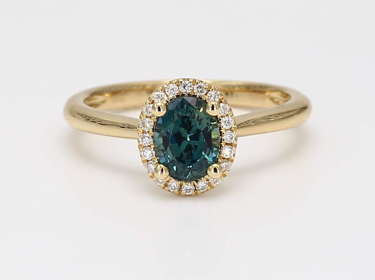 OVAL UNHEATED TEAL SAPPHIRE GIA 2235532360 & ROUND DIAMOND 14KY RING