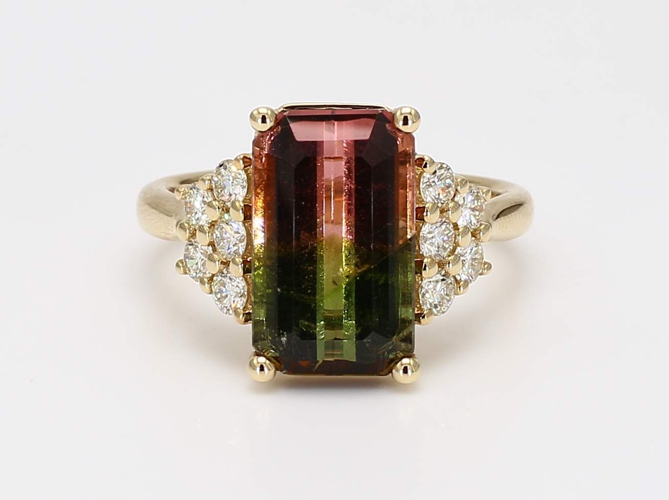EMERALD CUT WATERMELON TOURMALINE & ROUND DIAMOND 14KY RING