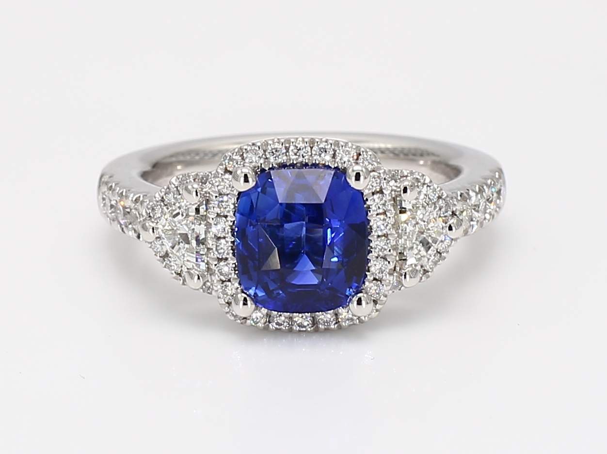 CUSHION SAPPHIRE & EPAULETTE DIAMOND & ROUND DIAMOND PLATINUM RING