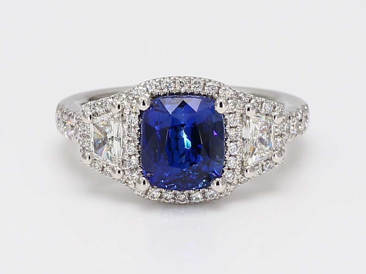 CUSHION SAPPHIRE CDC 25051117 & TRAPEZOID DIAMOND & ROUND DIAMOND PLATINUM RING