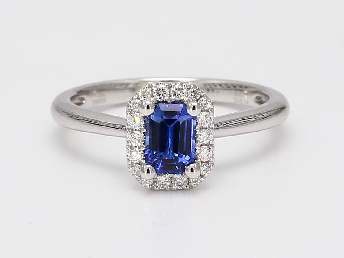 EMERALD CUT SAPPHIRE & ROUND DIAMOND 14KW RING