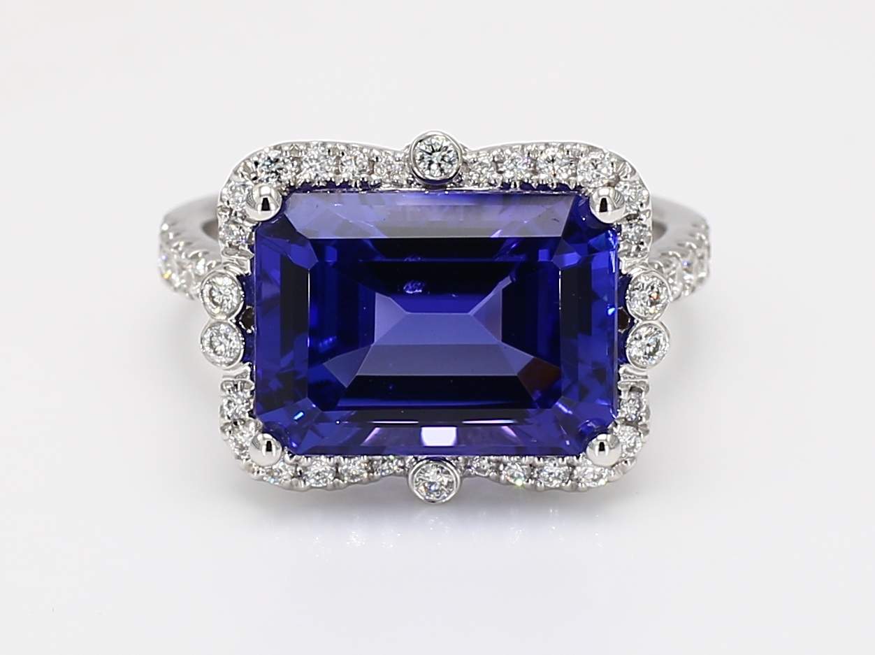 EMERALD CUT TANZANITE & ROUND DIAMOND 14KW RING