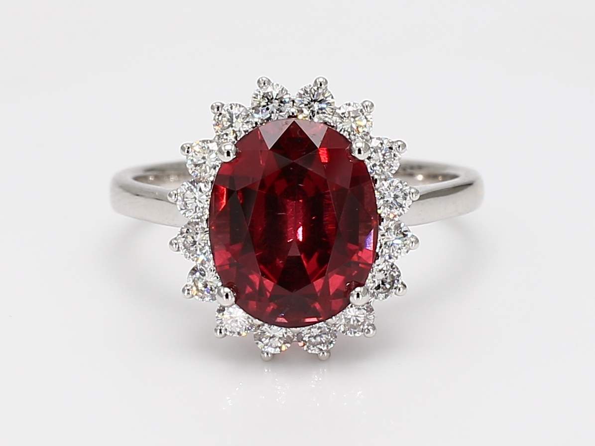 OVAL MALAYA GARNET & ROUND DIAMOND 18KW RING