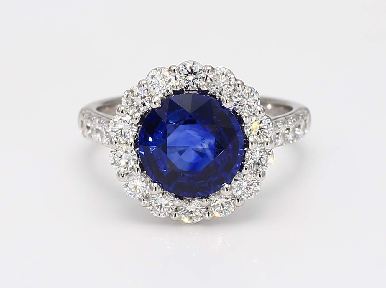 ROUND SAPPHIRE VIVID BLUE BELLEROPHON B9250 & ROUND DIAMOND PLATINUM RING