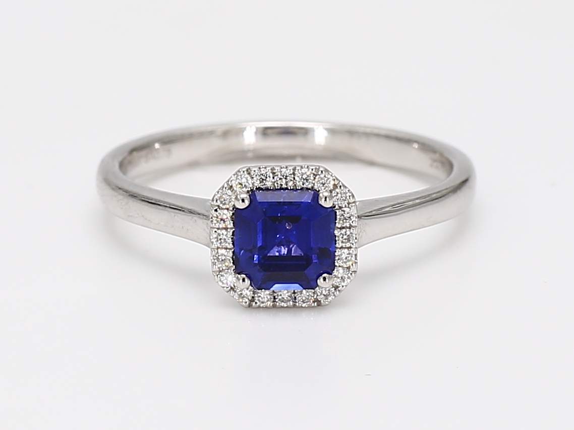 SQUARE EMERALD CUT SAPPHIRE & ROUND DIAMOND 14KW RING