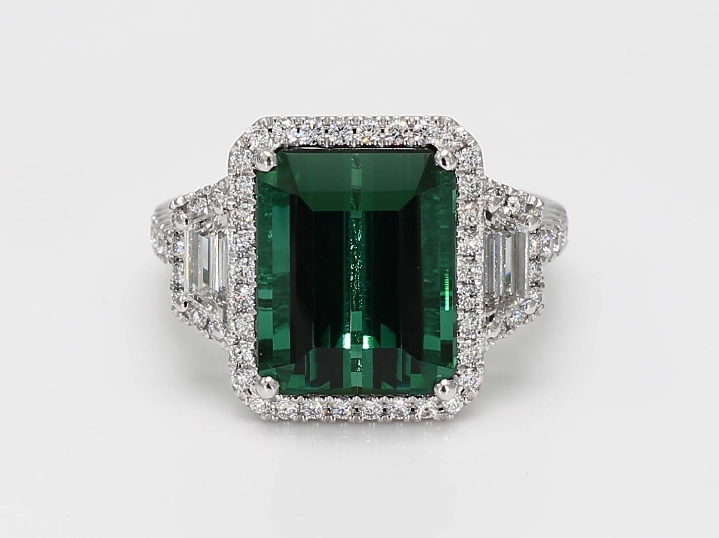 EMERALD CUT GREEN TOURMALINE & TRAPEZOID & ROUND DIAMOND PLATINUM RING