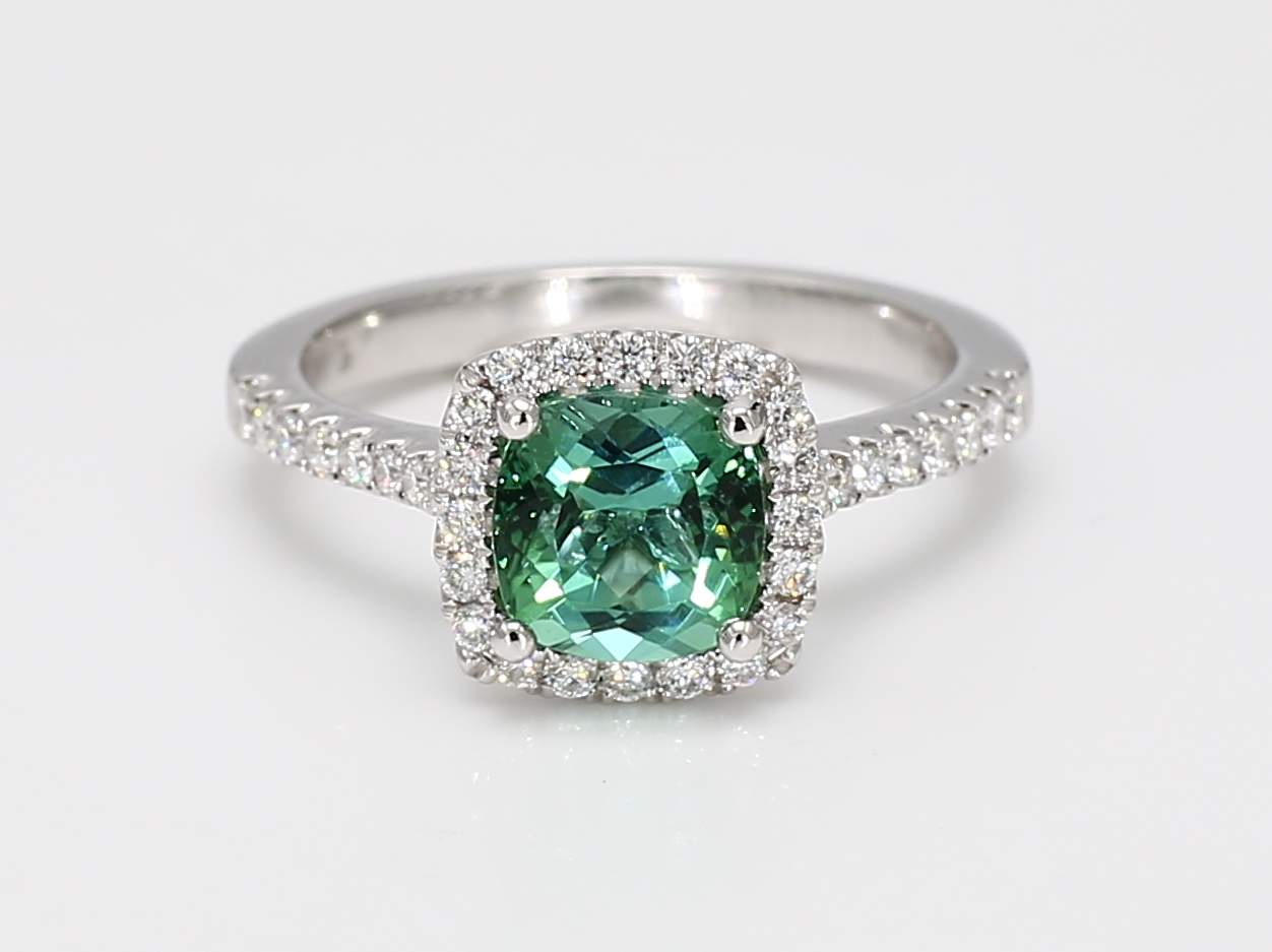 CUSHION GREEN TOURMALINE & ROUND DIAMOND 14KW RING