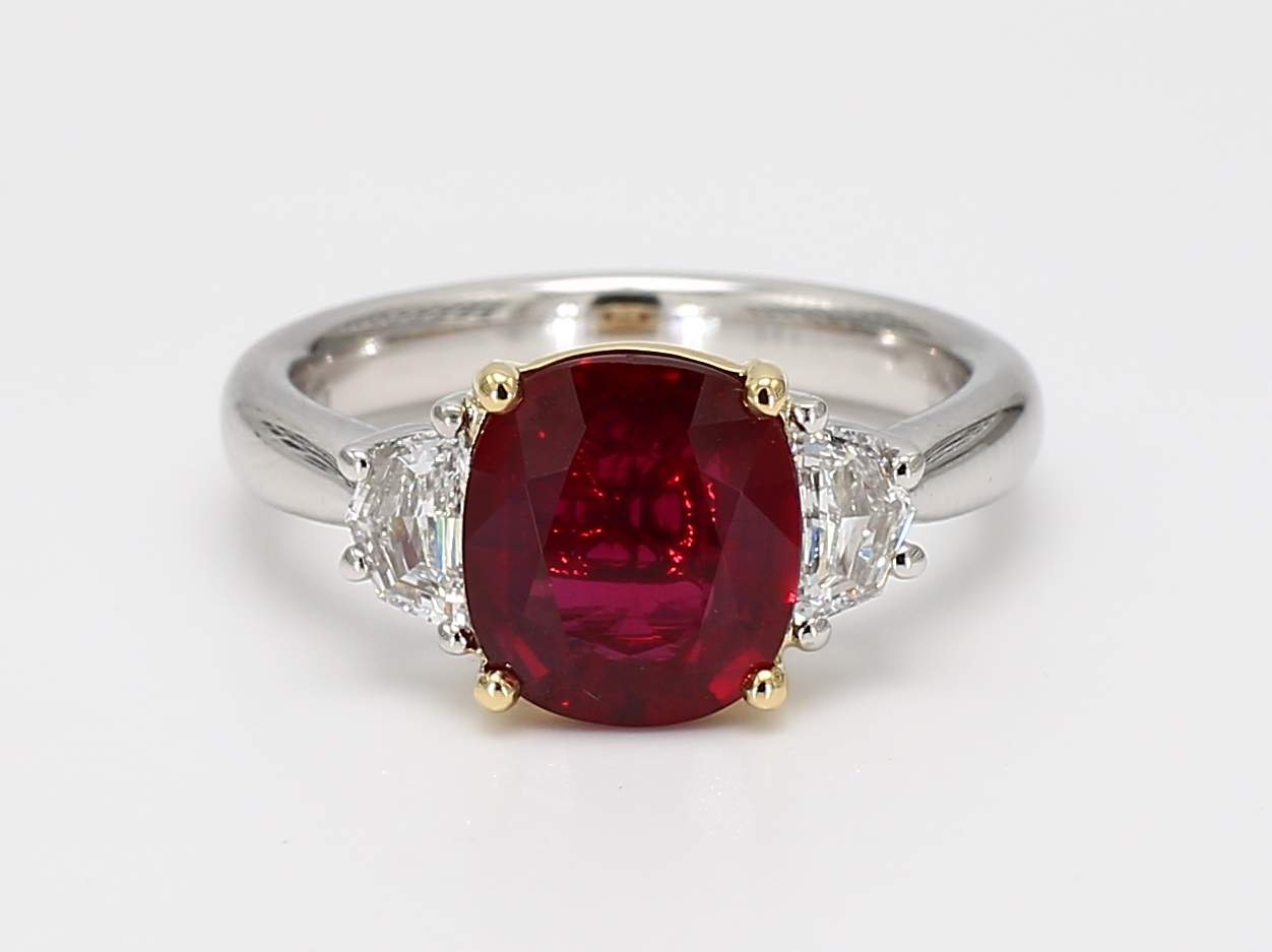 CUSHION RUBY VIVID RED CDC 2405974 & EPAULETTE DIAMOND 18KY & PLATINUM RING