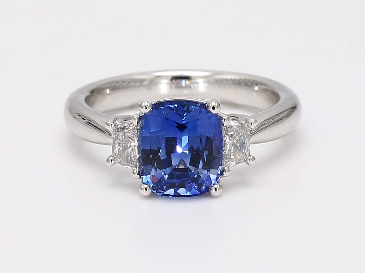 CUSHION CEYLON SAPPHIRE CDC 2405982 & TRAPEZOID DIAMOND PLATINUM RING