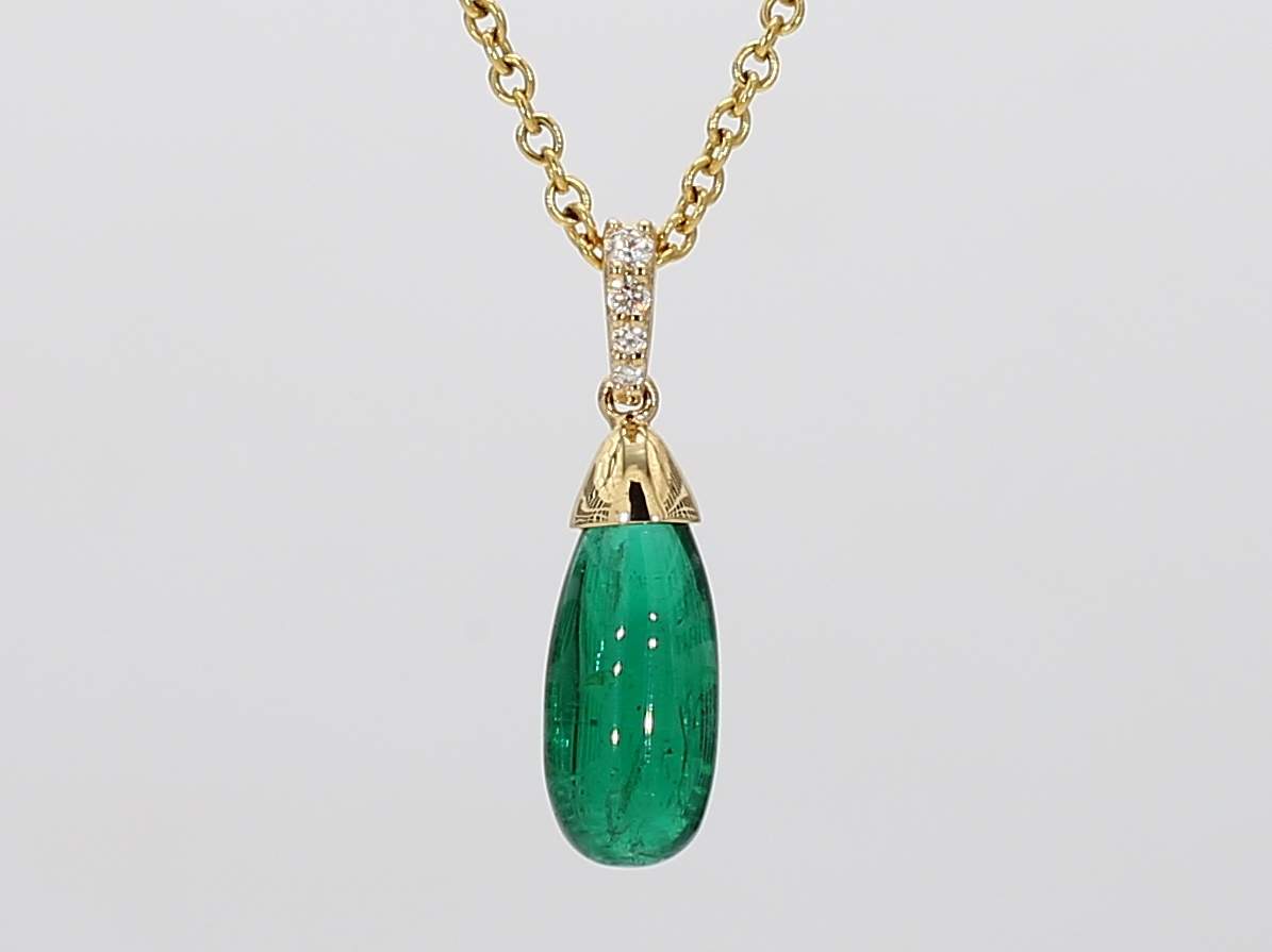 TEAR DROP EMERALD & ROUND DIAMOND 18KY PENDANT