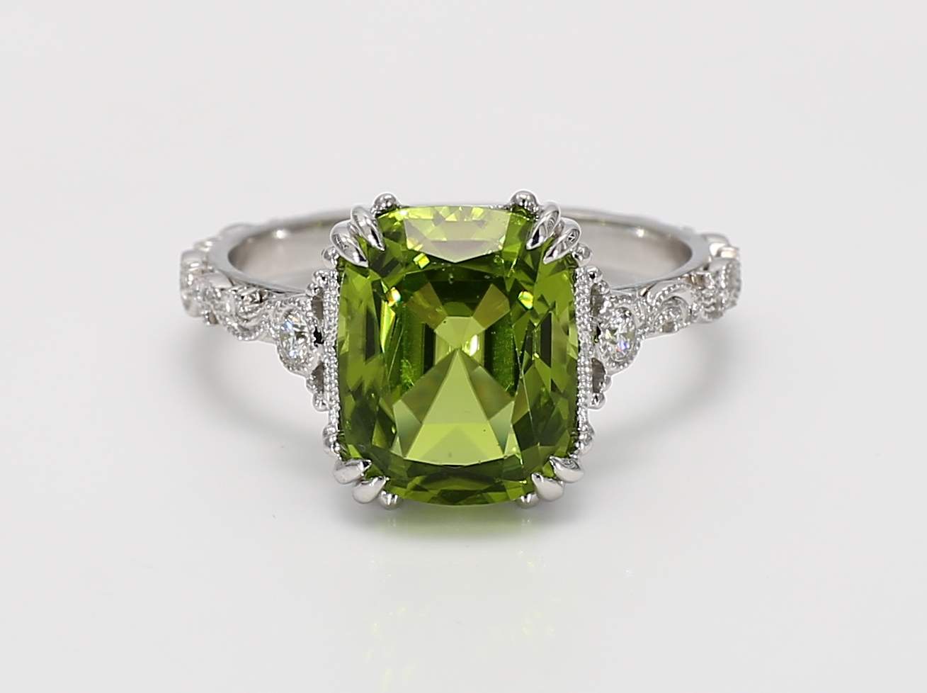 CUSHION PERIDOT & ROUND DIAMOND 14KW RING