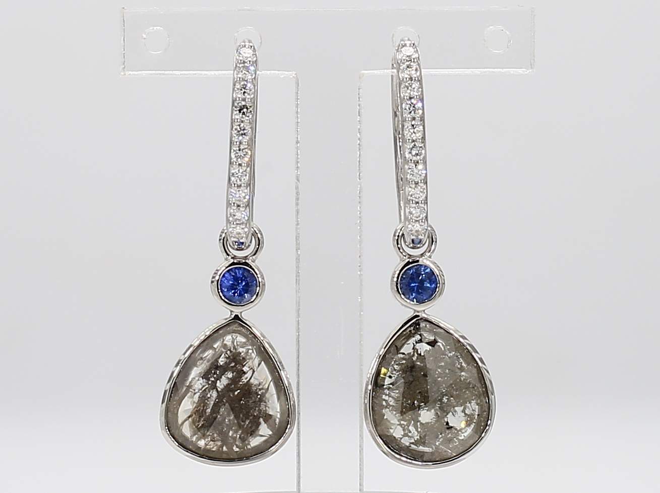 PEAR SHAPE SALT & PEPPER DIAMOND & ROUND SAPPHIRE & ROUND DIAMOND 14KW EARRING