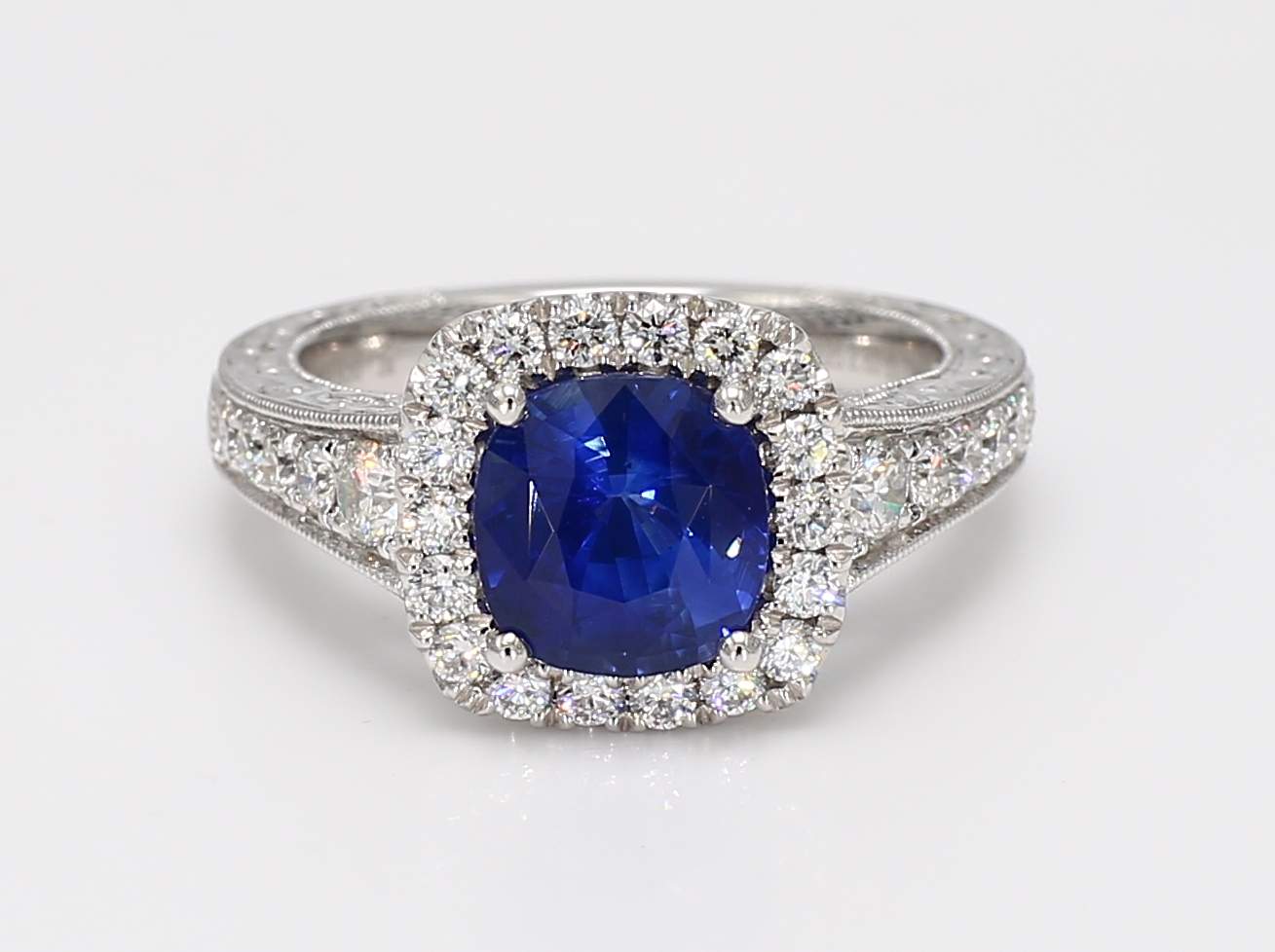CUSHION SAPPHIRE & ROUND DIAMOND PLATINUM RING