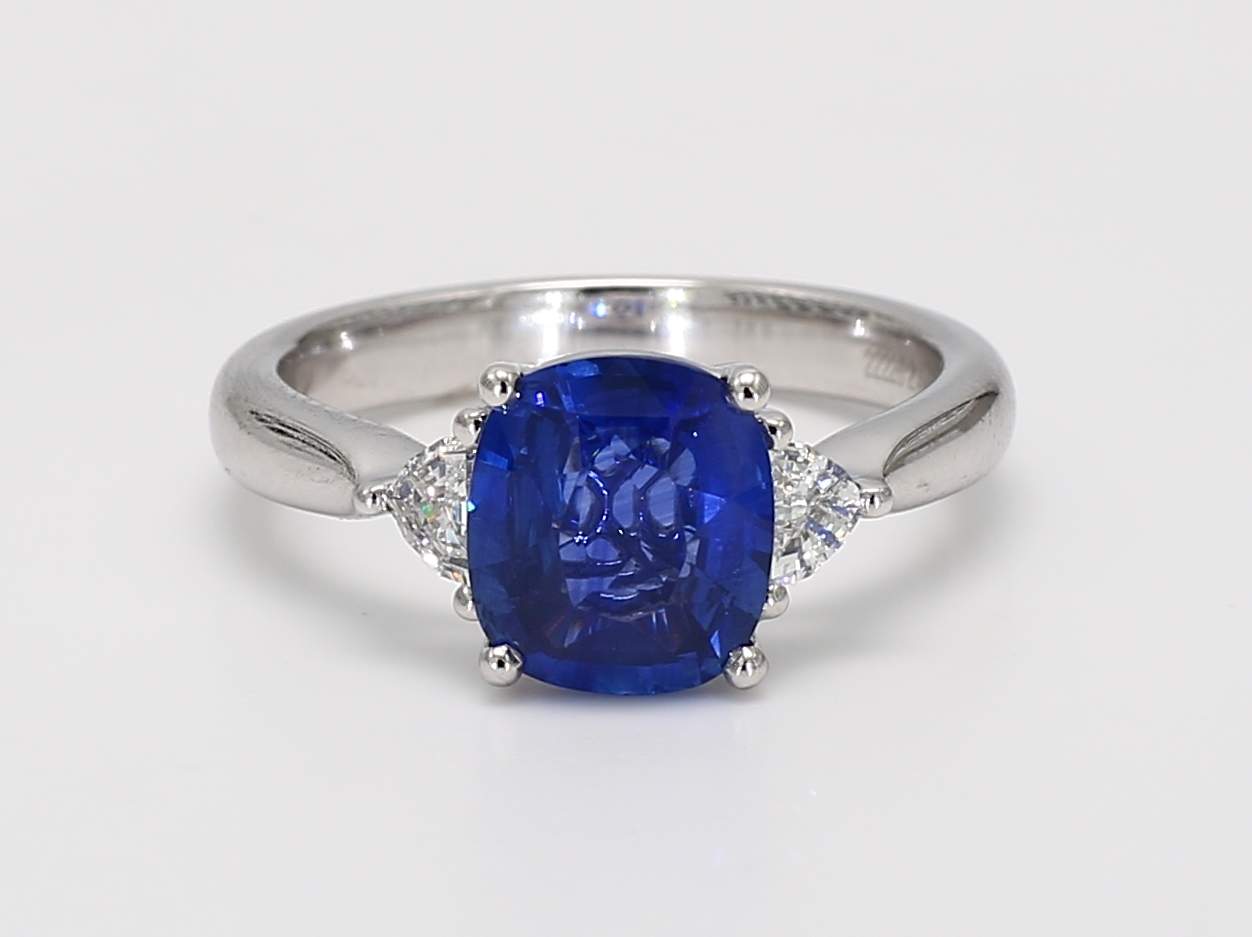 CUSHION SAPPHIRE & EPAULETTE DIAMOND PLATINUM RING