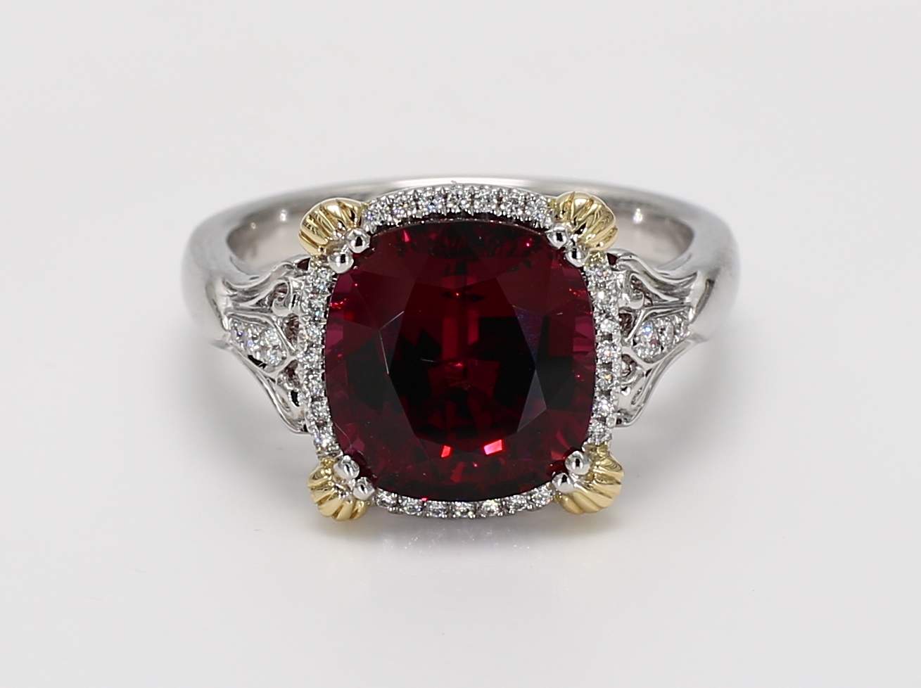 CUSHION RHODOLITE GARNET & ROUND DIAMOND 14KW RING