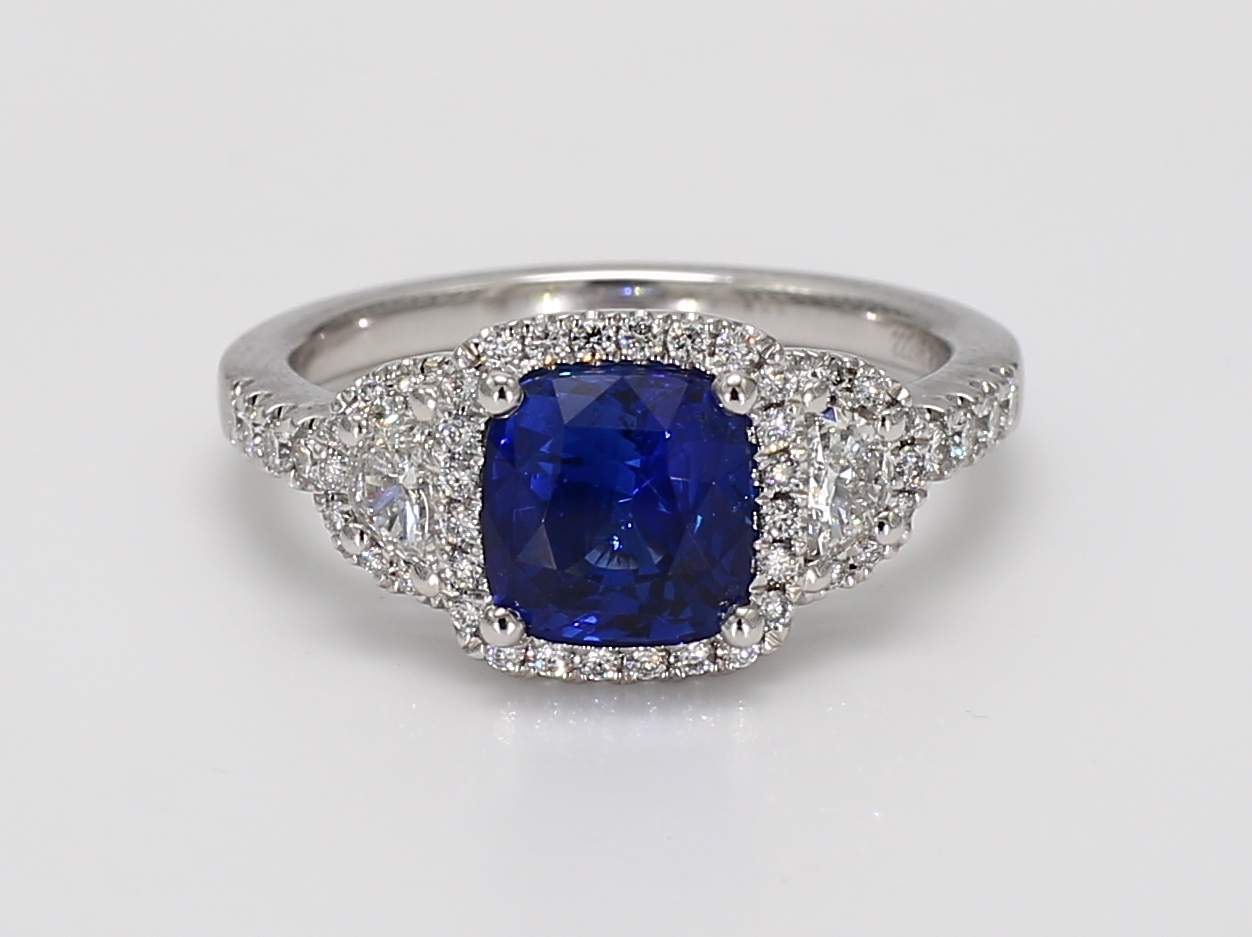 CUSHION SAPPHIRE & HALF MOON & ROUND DIAMOND PLATINUM RING