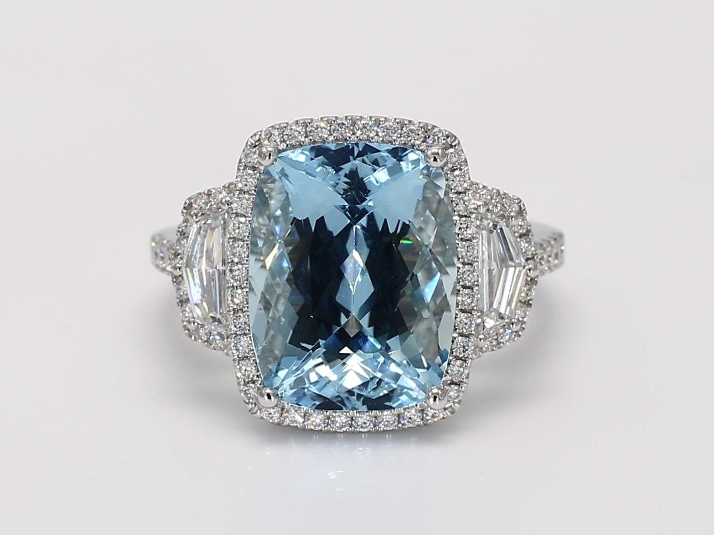 CUSHION AQUAMARINE & EPAULETTE & ROUND DIAMOND 14KW RING