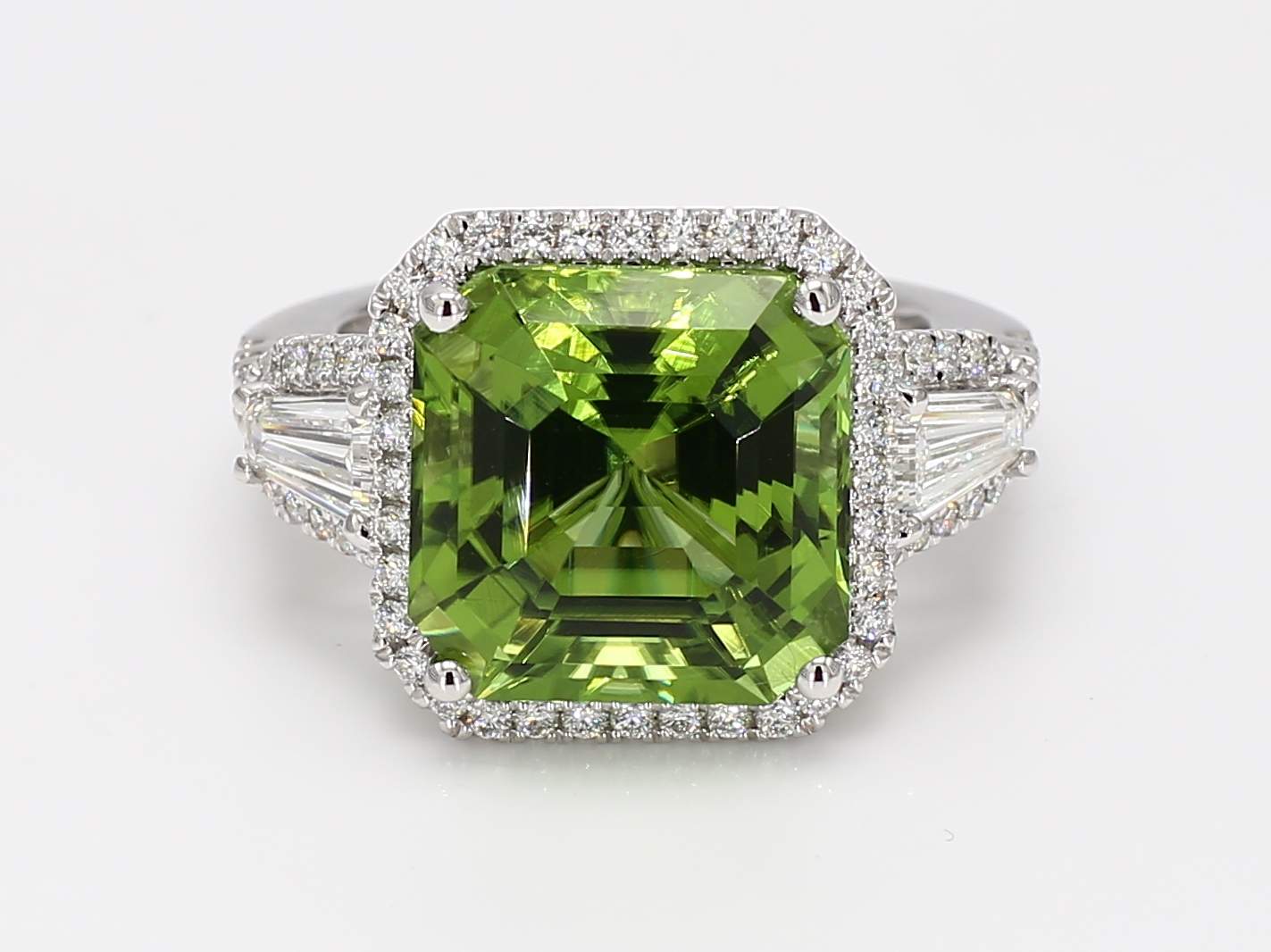 SQUARE EMERALD CUT PERIDOT & SHIELD DIAMOND E VVS1 GIA 7473696940 & SHIELD DIAMOND F IF GIA 2476946731 & ROUND DIAMOND 14KW RING