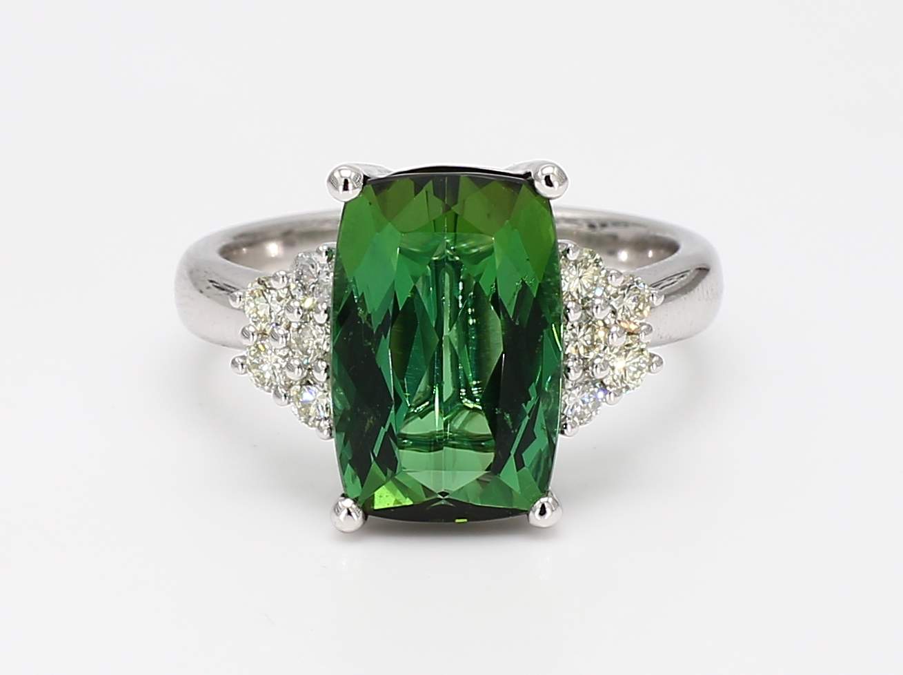 CUSHION GREEN TOURMALINE & ROUND DIAMOND 14KW RING