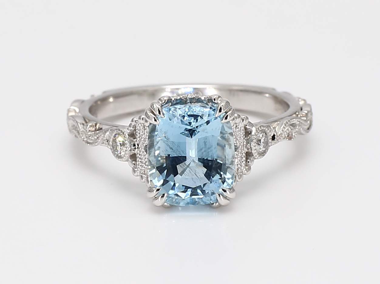 CUSHION AQUAMARINE & ROUND DIAMOND 14KW RING