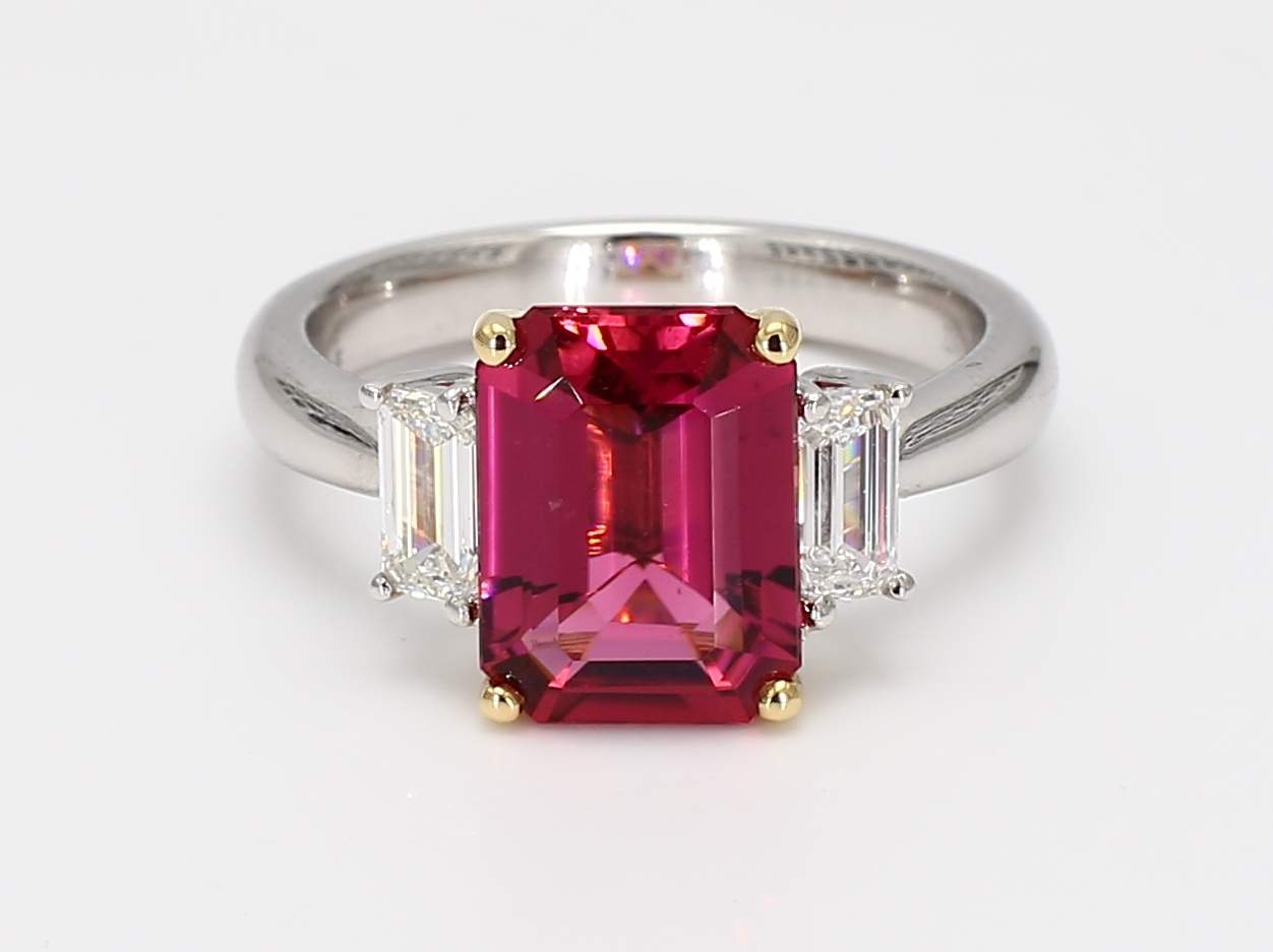EMERALD CUT PINK TOURMALINE & EMERALD CUT DIAMOND PLATINUM RING